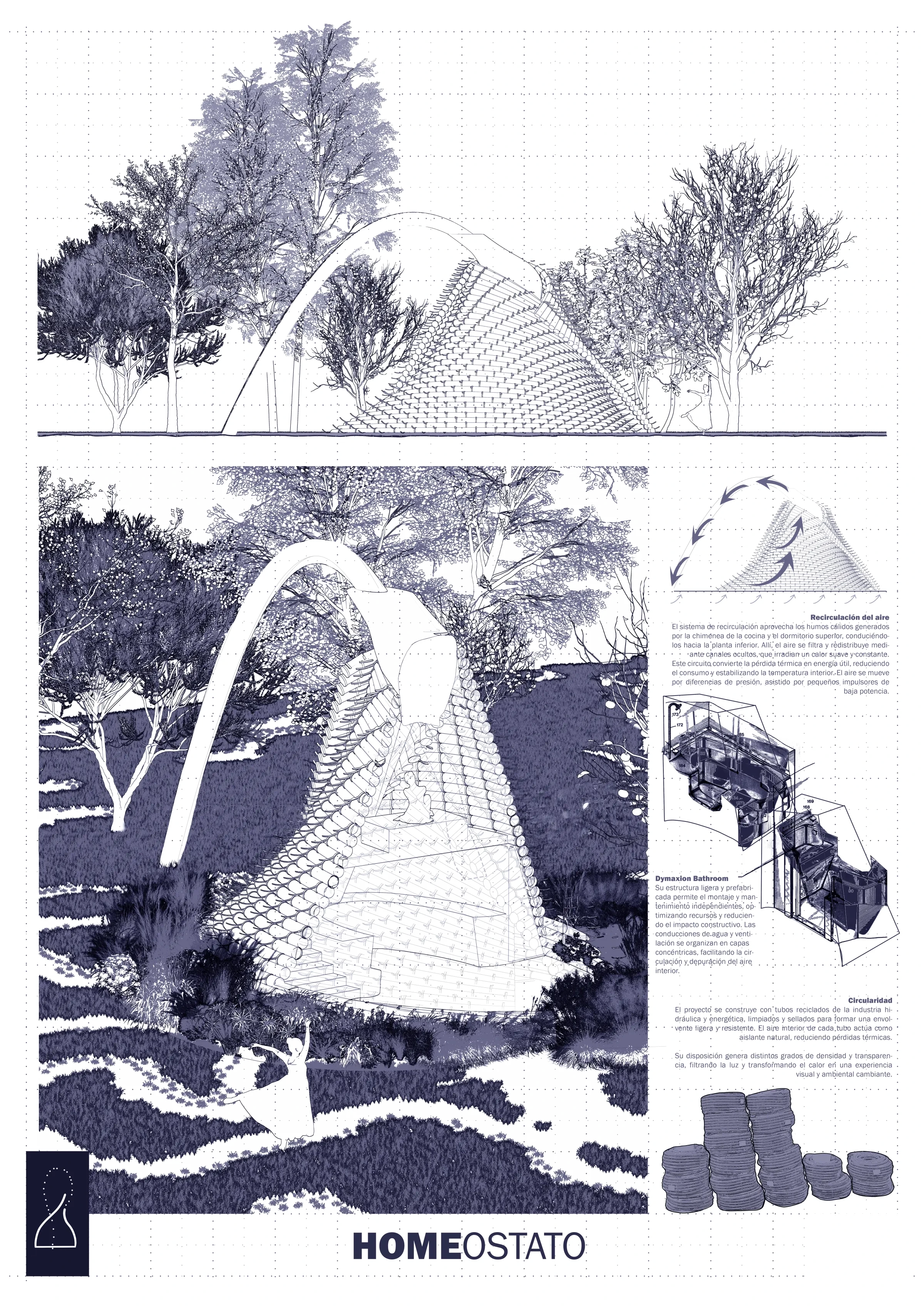 Envolvente de tubos rellenos de material aislante de alta densidad. Transmitancia térmica: 0,1 W/m²K (superior al estándar Passivhaus 0,15 W/m²K). Estructura ligera con geometría curva optimizada para eficiencia térmica. Factor de forma minimizado para reducir superficie expuesta. Coste constructivo inferior al de soluciones convencionales con peor rendimiento.