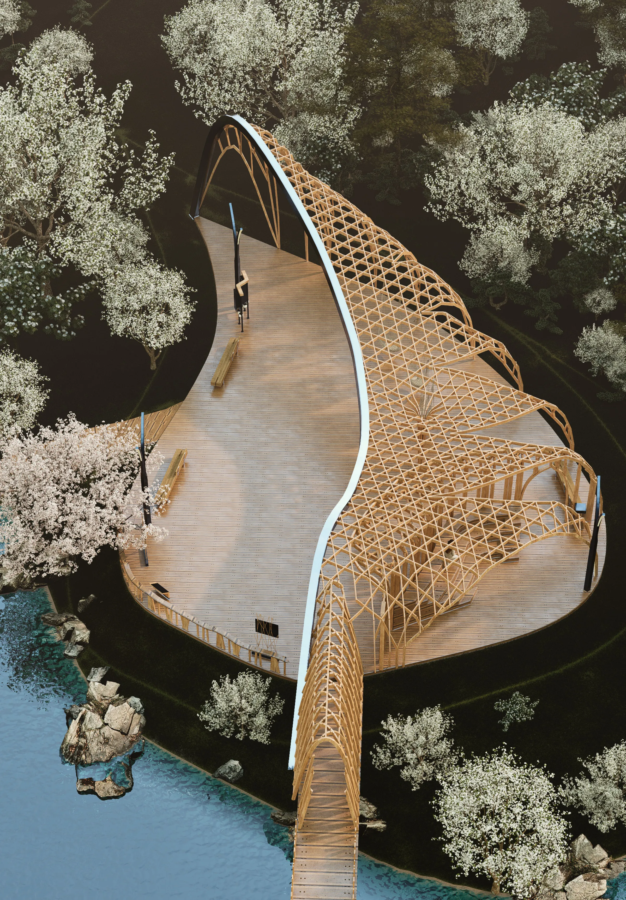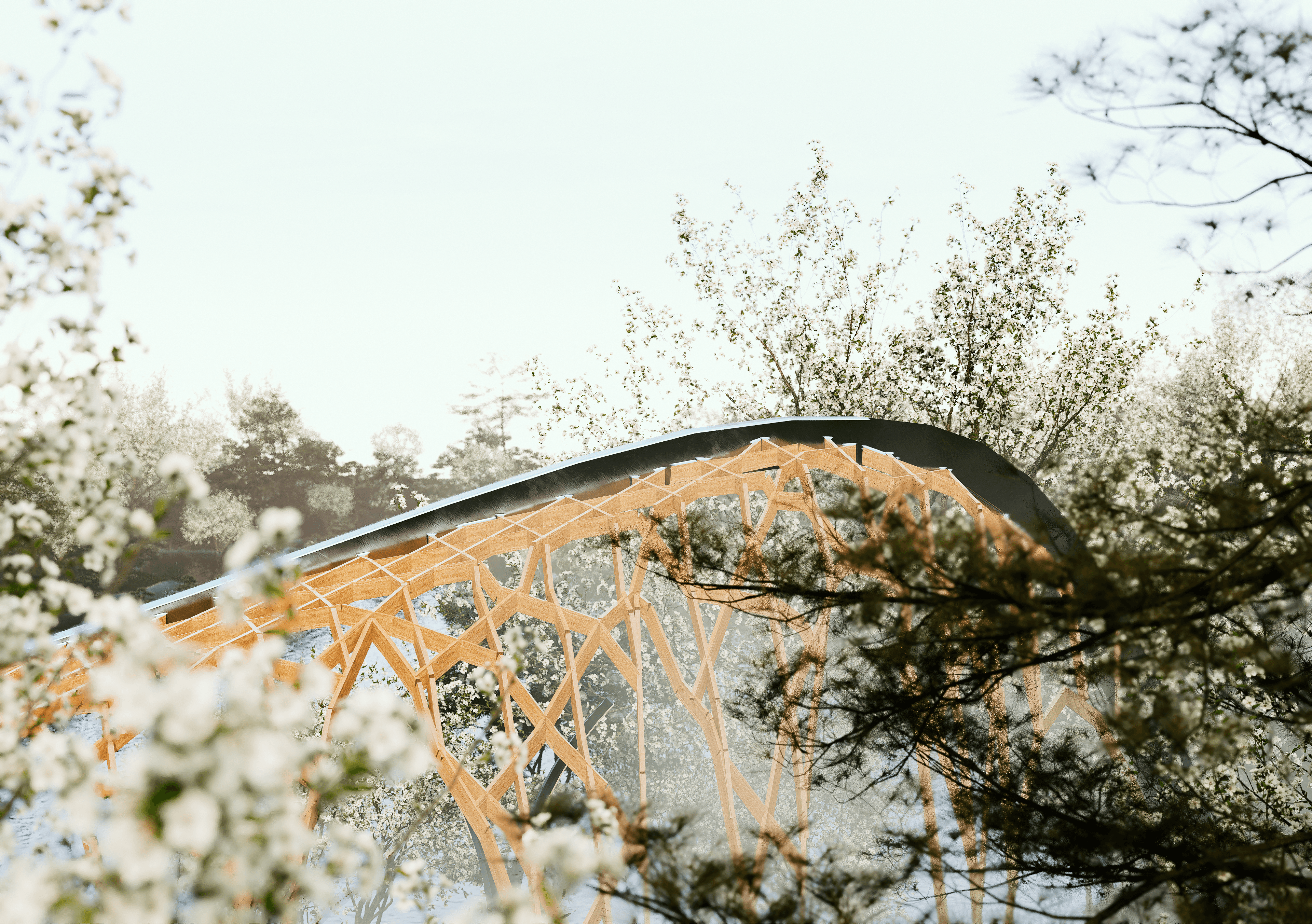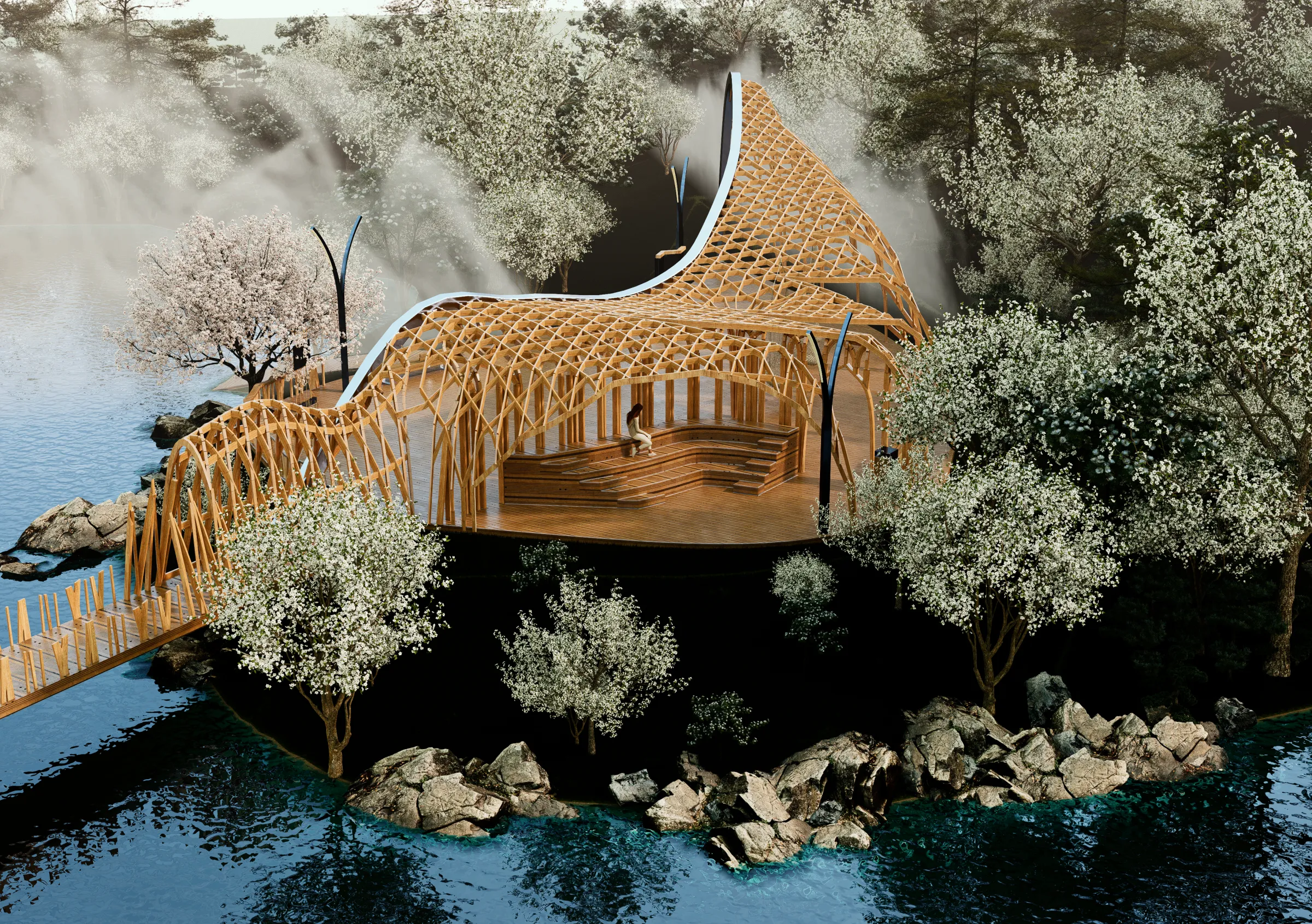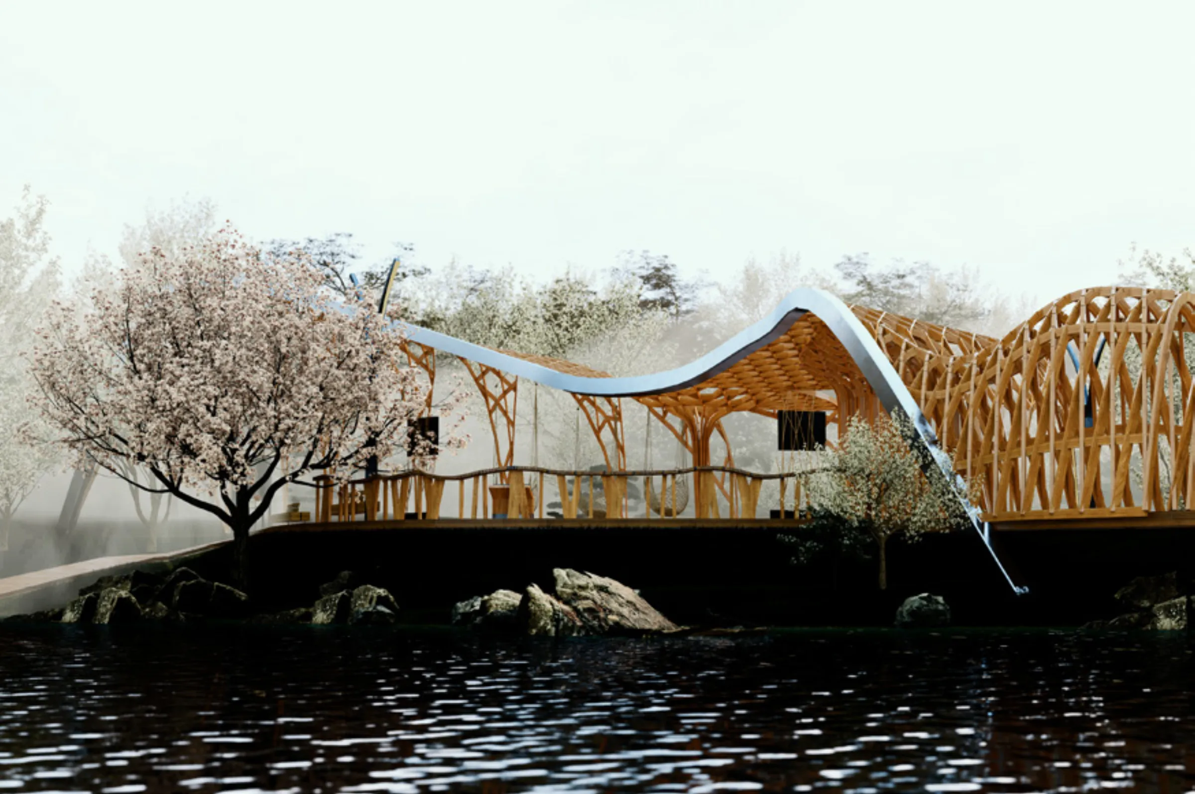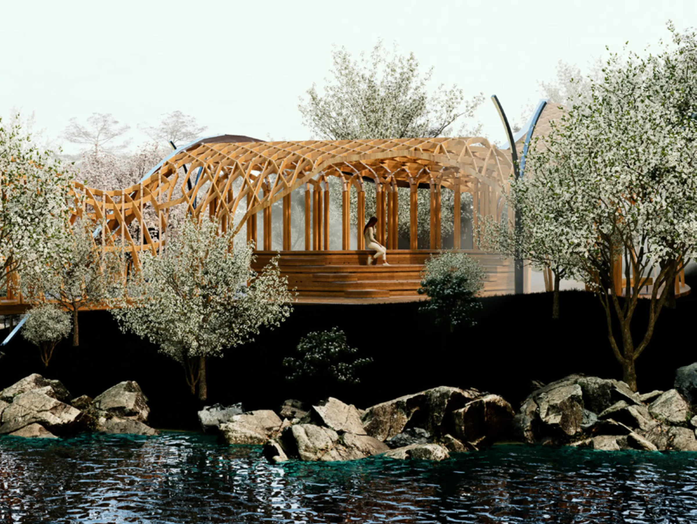 Queríamos representar todo esto a través de la arquitectura, pero no de manera literal y figurativa, sino de manera abstracta: a través de las formas y los materiales. Tomamos dos decisiones fundamentales: usar la madera como único material de todo el proyecto, y la forma como única estrategia de diseño.
