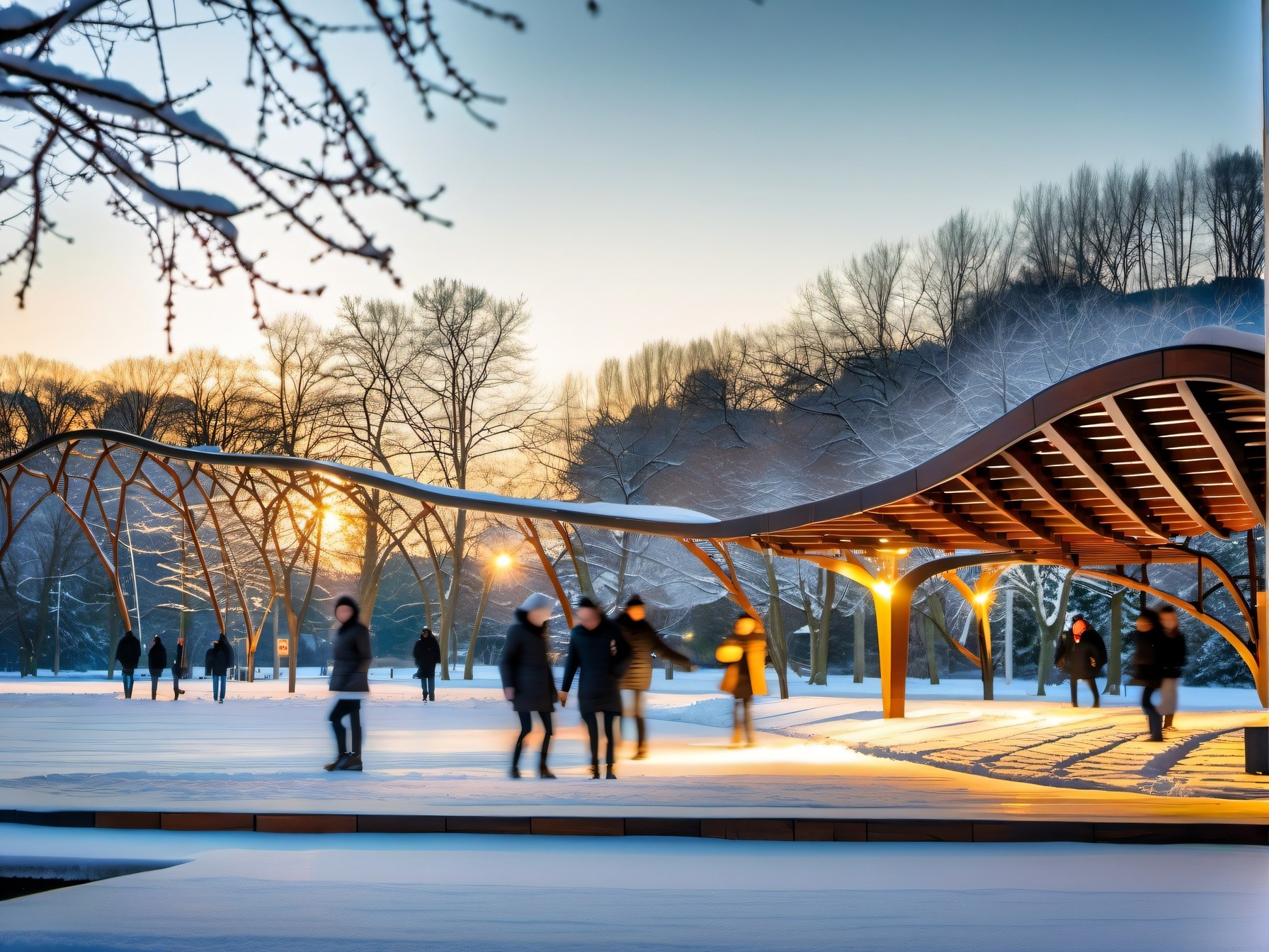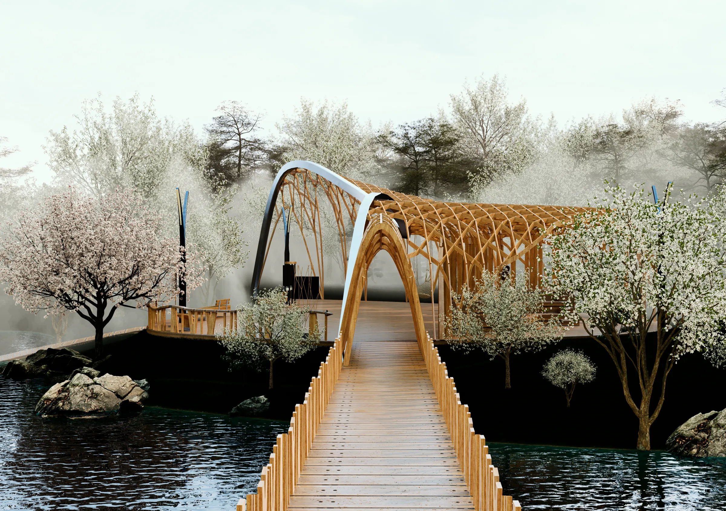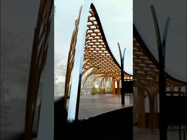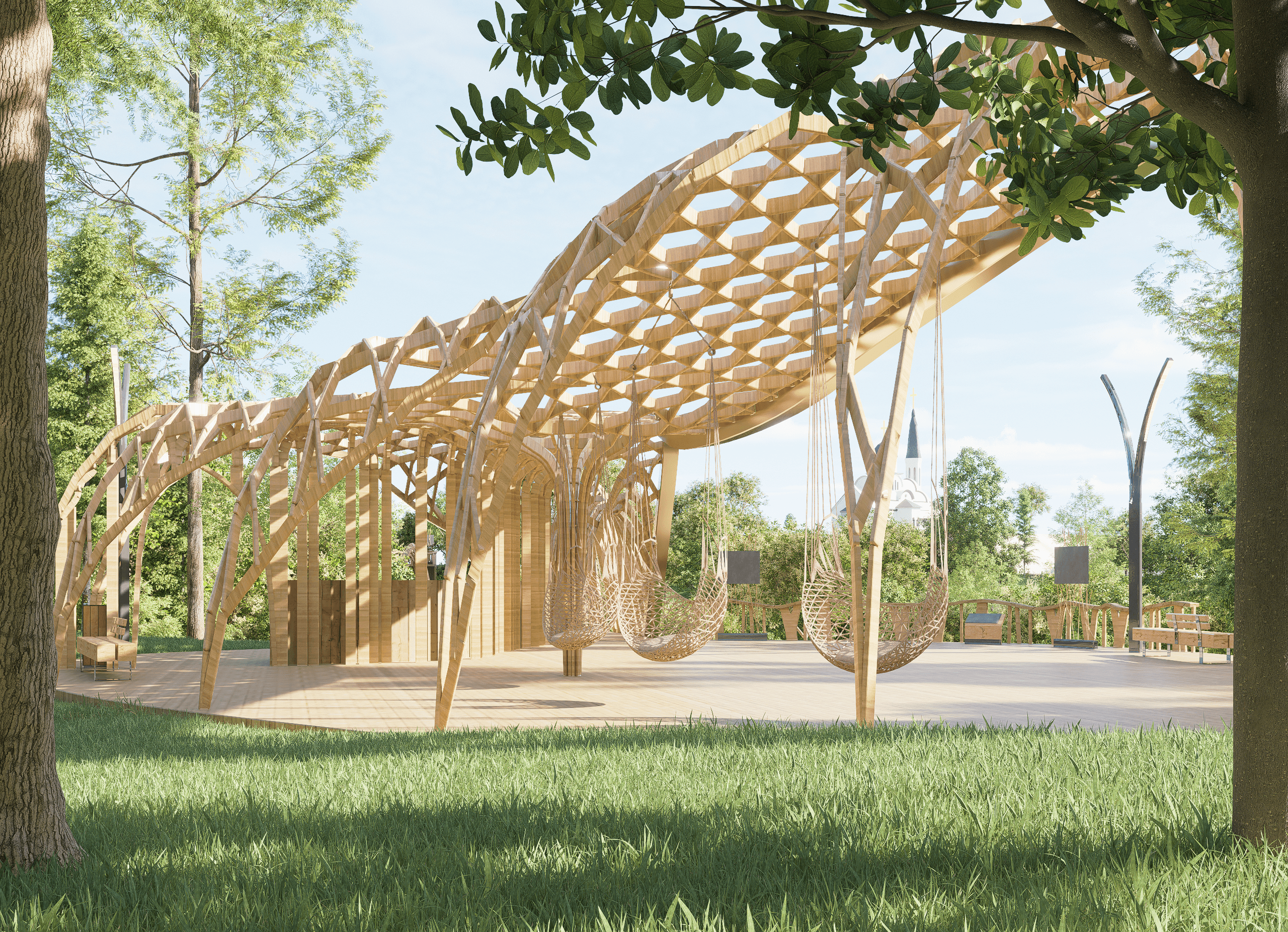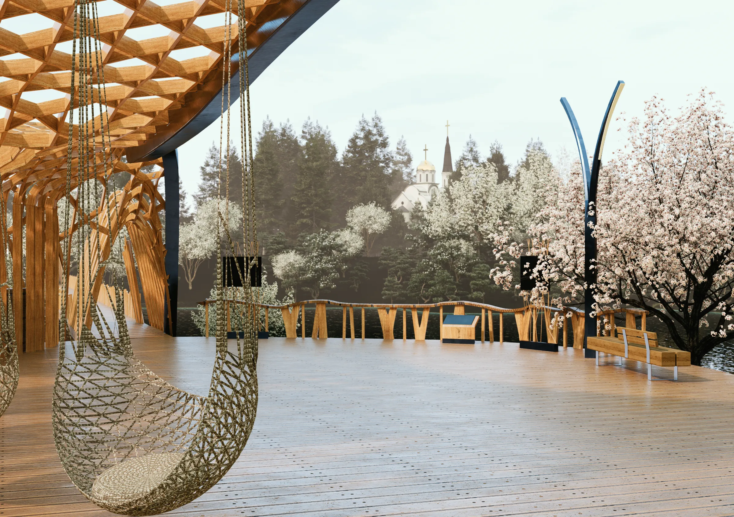 Madera como único material constructivo. Planta en forma de hoja del árbol autóctono del lugar. Puente peatonal en madera laminada. Mirador orientado hacia la iglesia. Entrada integrada en forma orgánica. Tratamiento de madera para clima continental ruso. En construcción (finalización prevista 2026).