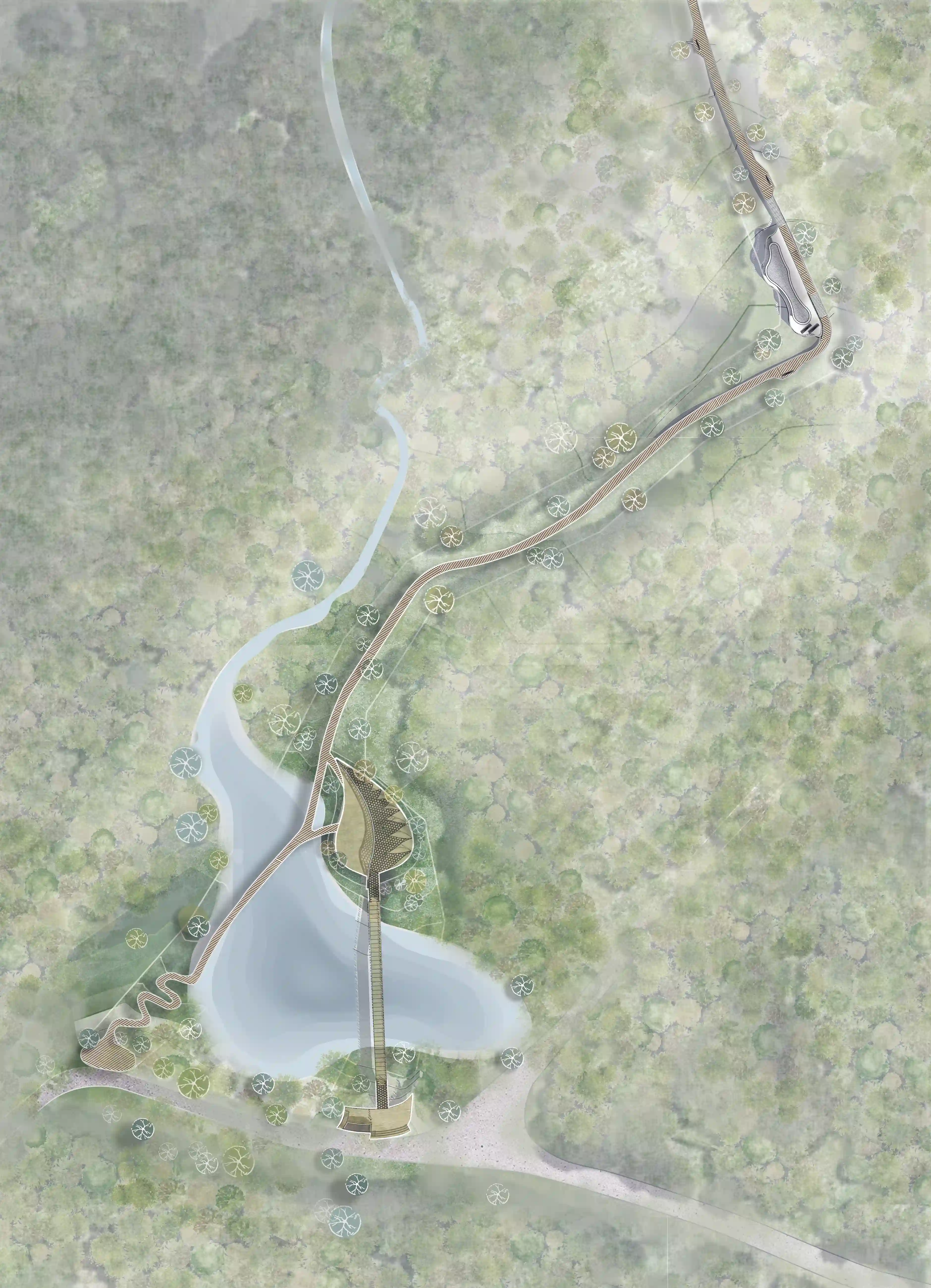 Le dimos al parque la forma de la hoja de la especie de árbol típica del lugar, integrando en ese contorno orgánico tres elementos programáticos: el puente, la entrada y el mirador. este último orientado hacia la iglesia del municipio, que es visible desde el parque. El respeto al paisaje fue prioritario en cada decisión.