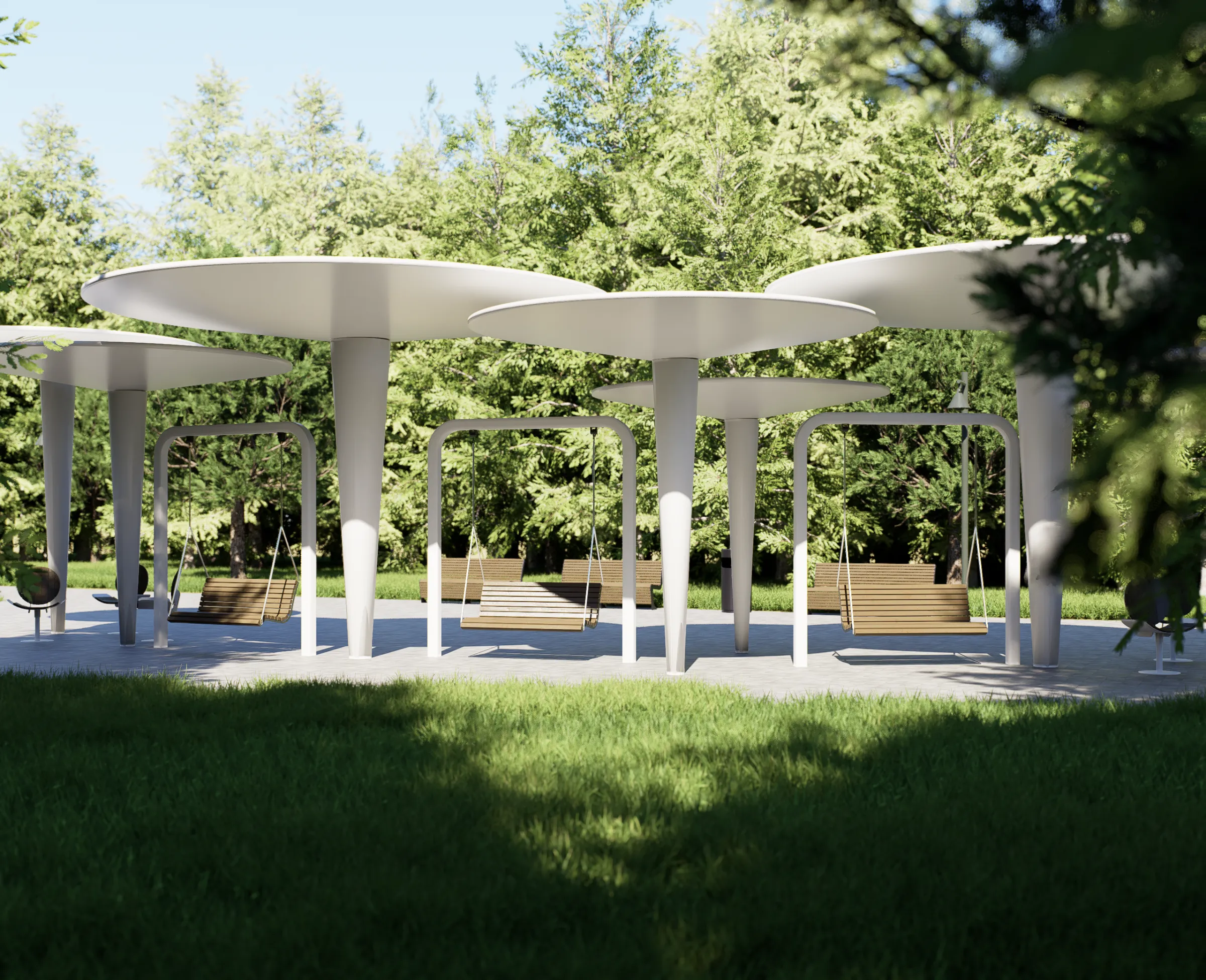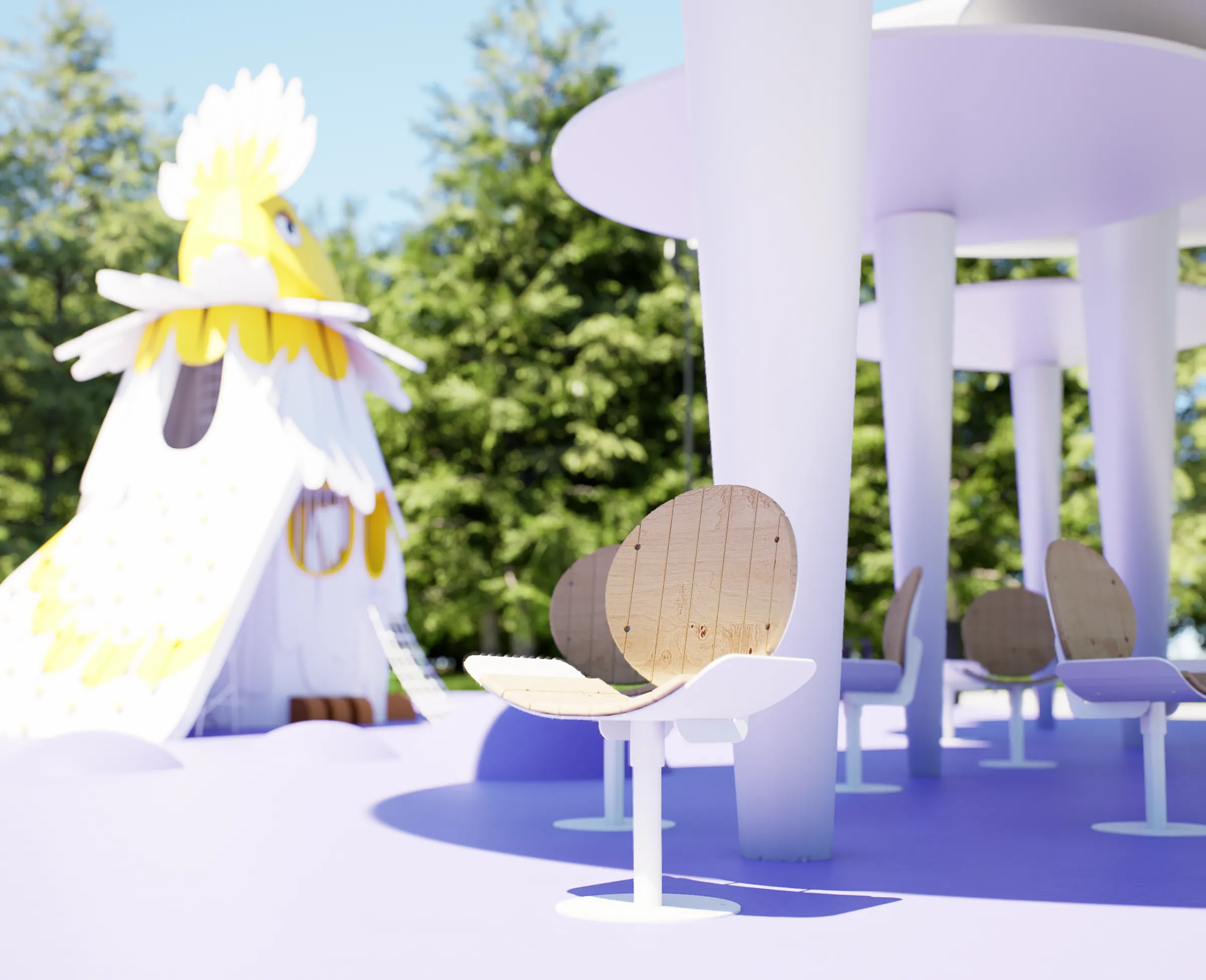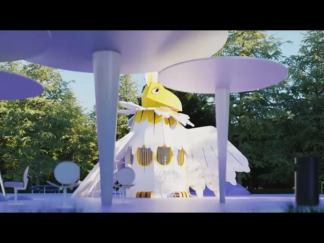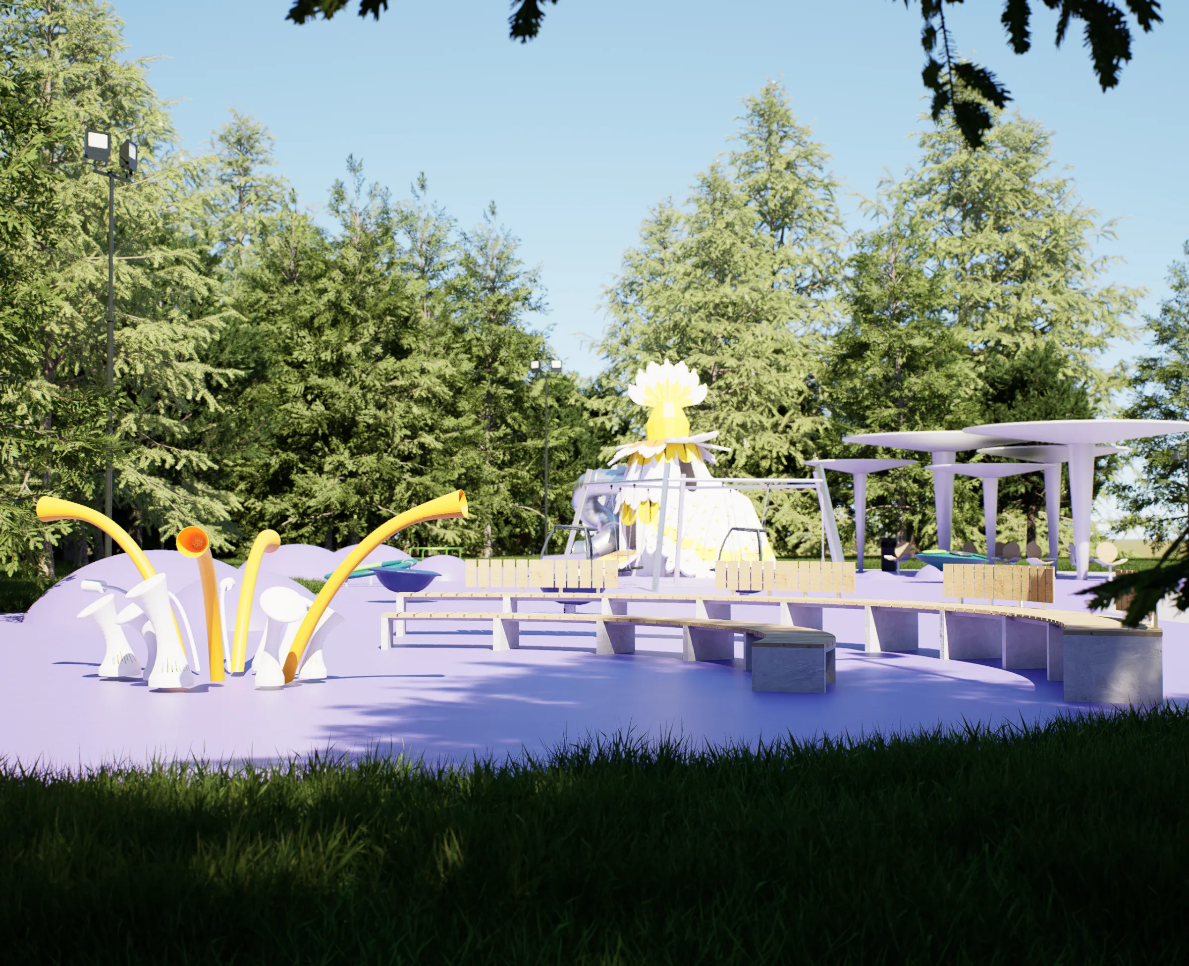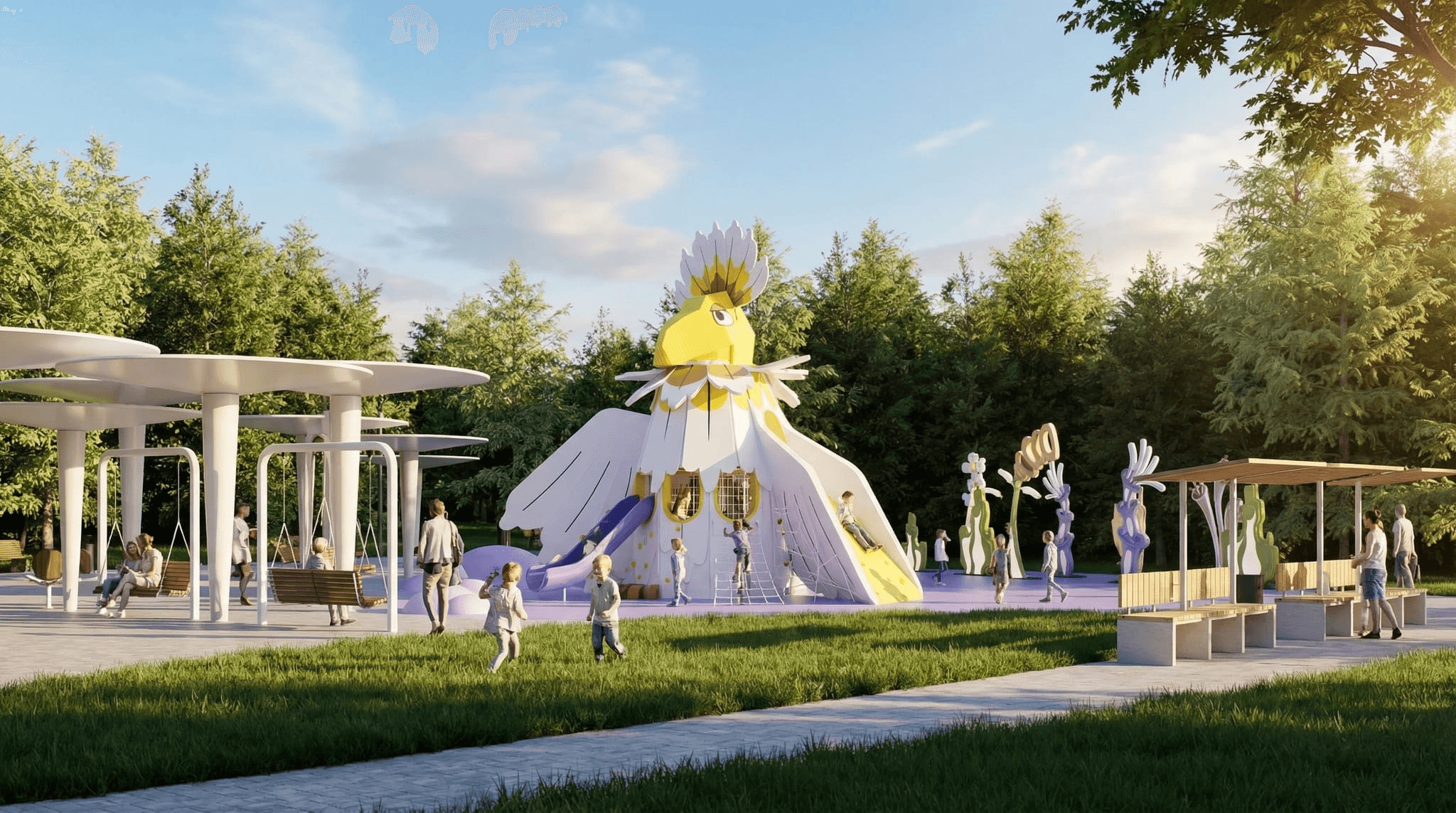 Columnas de inspiración movimiento moderno a diferentes alturas. Pavimentos de seguridad certificada en zonas infantiles. Elementos temáticos del personaje animado integrados. Vegetación resistente al clima continental de Moscú. Iluminación pública. Mobiliario diferenciado niños y adultos.