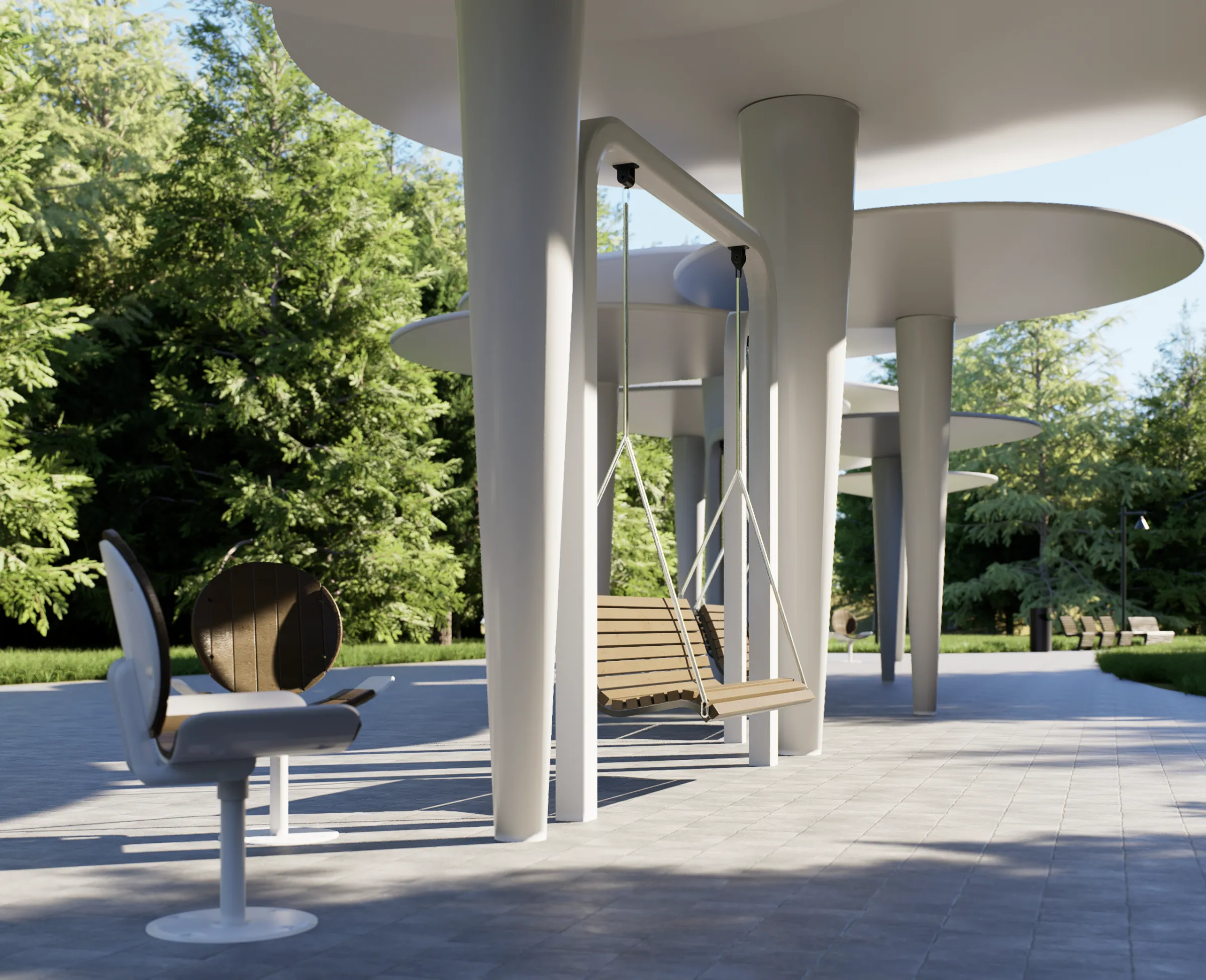 Por otro lado, la proximidad al museo de arquitectura nos dio la oportunidad de rendir homenaje a la disciplina. Diseñamos los espacios exteriores incorporando columnas típicas del movimiento moderno, colocadas a diferentes alturas, que generan un juego de sombras cambiante a lo largo del día y delimitan zonas de estancia para los adultos.