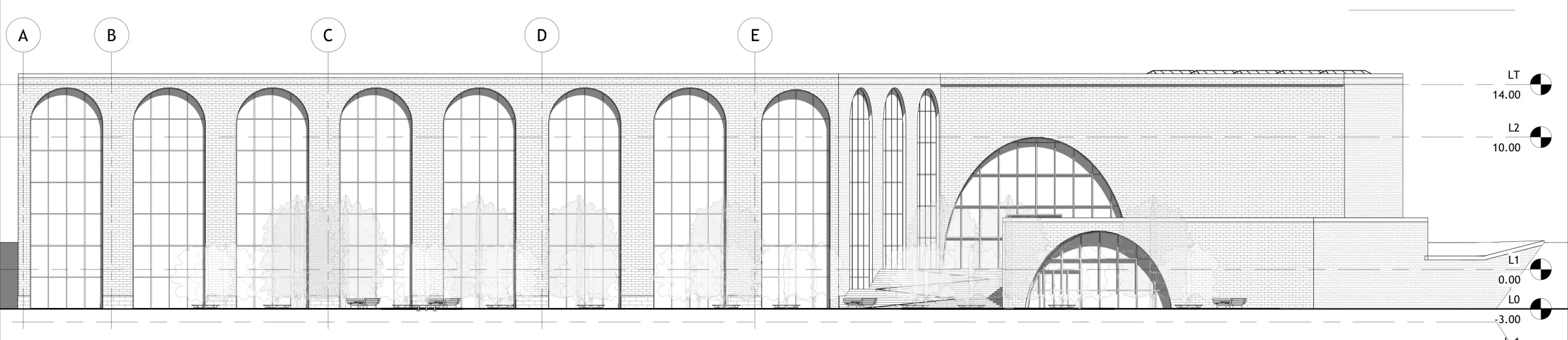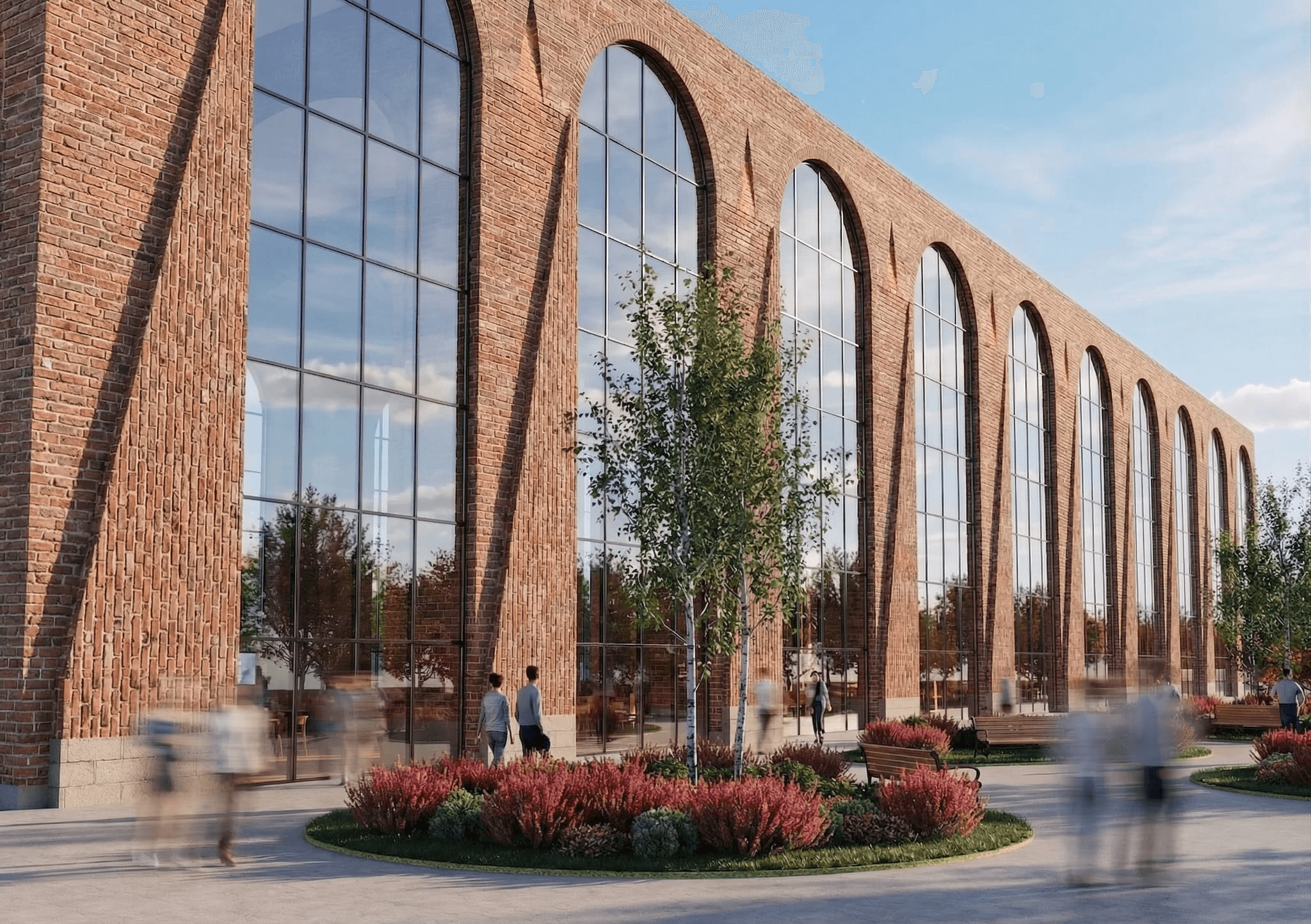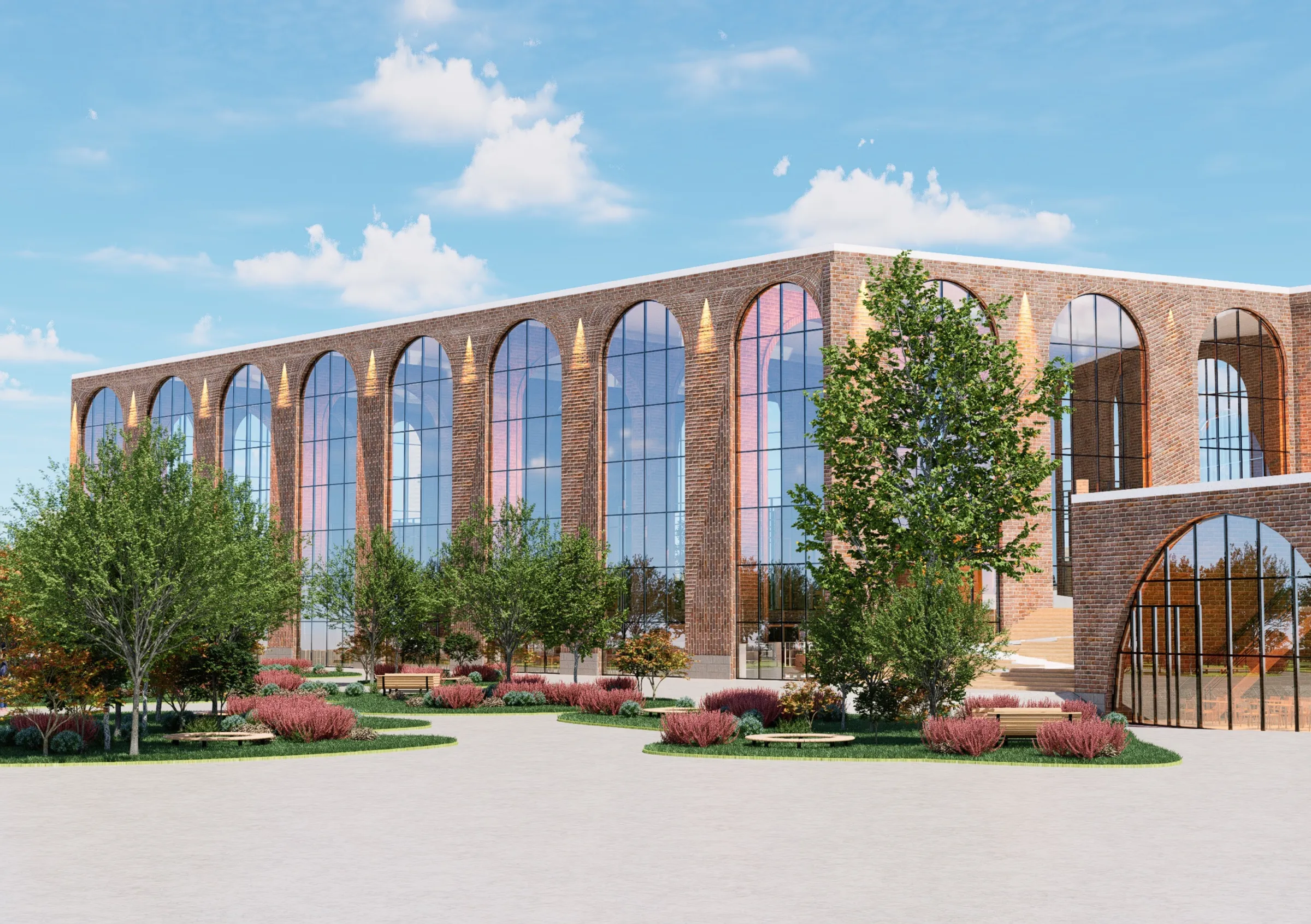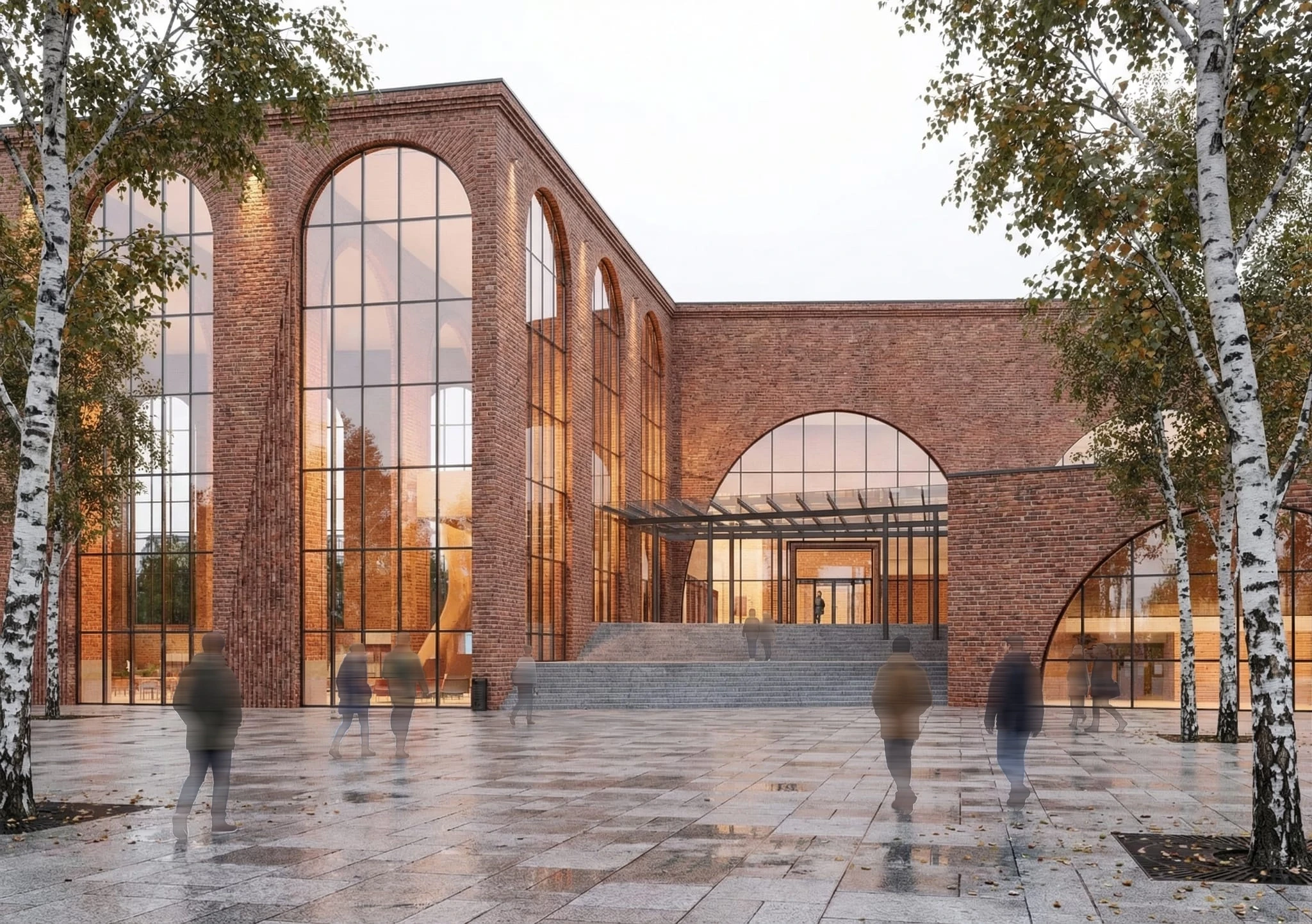 Fachada de ladrillo cerámico en continuidad con la materialidad histórica de Tampere. Arcos estructurales reinterpretados en clave contemporánea. Espacios intermedios de transición interior-exterior. Cubierta con aislamiento reforzado. Jardín-parque público frontal. Iluminación natural optimizada para latitudes altas.