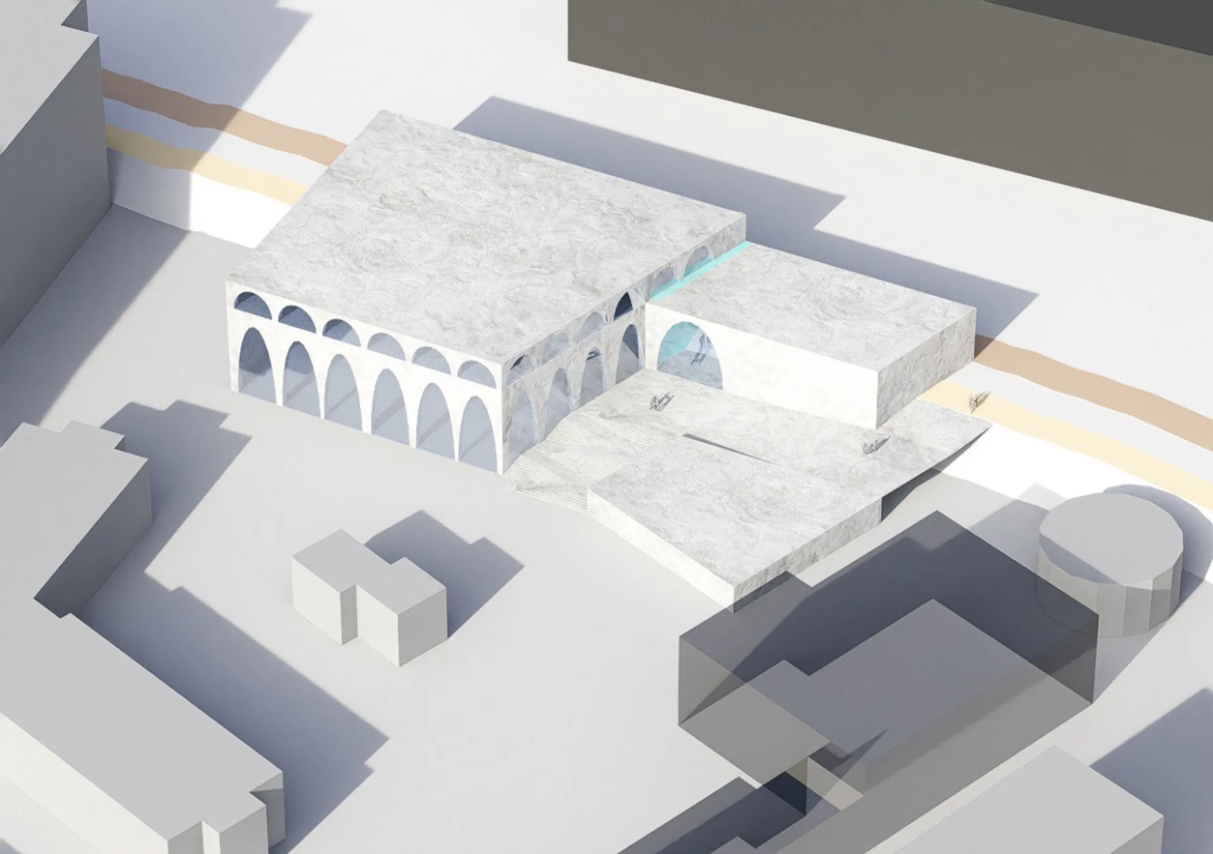 Los arcos, elemento definitorio de la Tampere histórica, se elevan y reinterpretan creando en el interior una especie de templo dedicado a la ciudad, su historia y su cultura. El terreno se aprovecha para generar espacios intermedios y de tránsito, tanto en el interior como en el exterior, de manera que el proyecto no interrumpa la conexión urbana de un lado a otro sino que cree ese espacio intermedio donde se puede pasar, permanecer y desarrollar múltiples actividades.